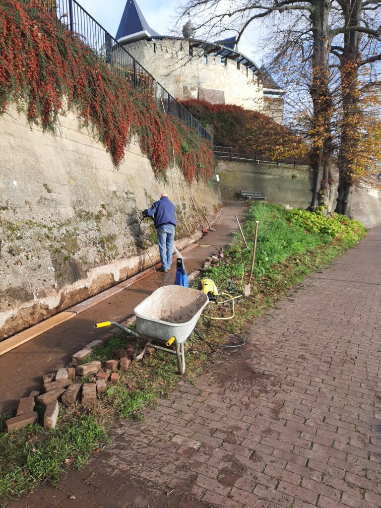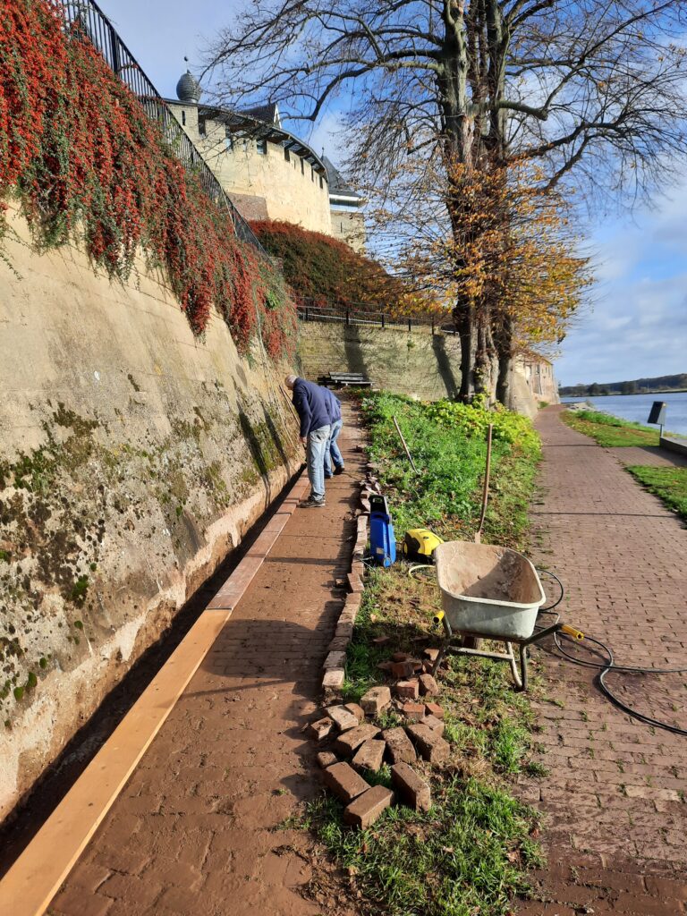 Vanmorgen werd er hard gewerkt aan de Maas ter hoogte van het oude kerkhof. De rolstoel oprit om door het kleine poortje naar de kasteel tuin te gaan werd opgeknapt. Doordat de zijkant tegen de muur was beschadigd door water wat voor verzakkingen zorgde moest de onderhoudsploeg het opnieuw gedeeltelijk uitgraven. Er komt een nieuwe betonnen rand zodat het pad weer jaren gebruikt kan worden.