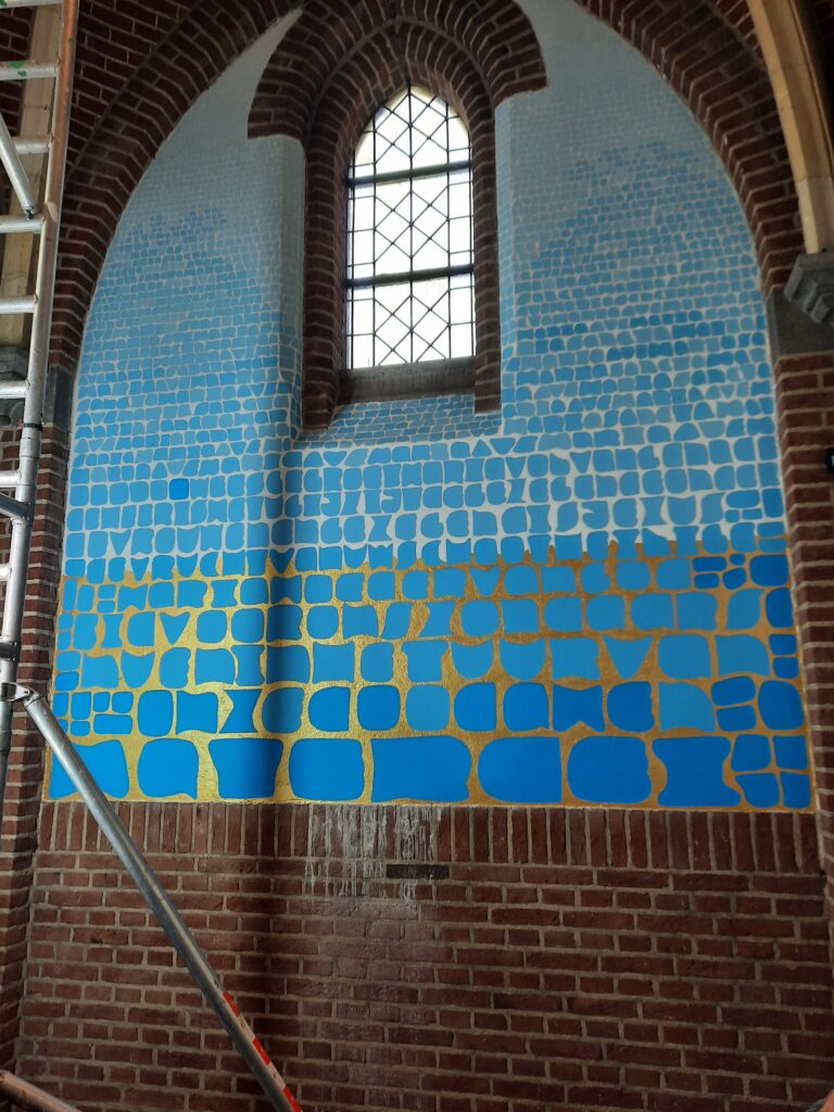 Vanmorgen nam ik een kijkje in onze kerk. De ploeg van vrijwilligers is daar ijverig bezig om met name de Maria kapel toegankelijk te maken voor publiek, ook als de rest van de kerk gesloten is. Er verrijst een prachtige glazen wand en Kapelaan Ranil heeft al bijna een muur beschilderd in wit, hemelsblauw en goud. Wat er op staat, daar komen we later nog op terug.