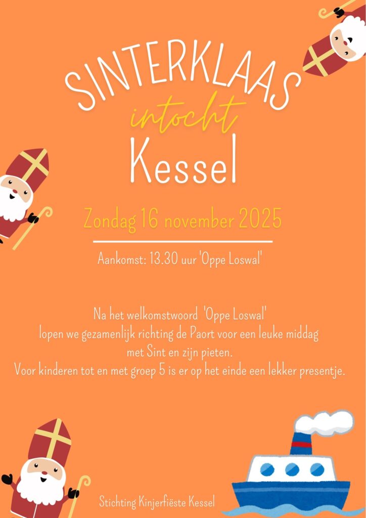 Op ๐˜‡๐—ผ๐—ป๐—ฑ๐—ฎ๐—ด ๐Ÿญ๐Ÿฒ ๐—ป๐—ผ๐˜ƒ๐—ฒ๐—บ๐—ฏ๐—ฒ๐—ฟ ๐Ÿฎ๐Ÿฌ๐Ÿฎ๐Ÿฑ komt Sinterklaas samen met zijn Pieten per boot weer aan in Kessel, rond ๐Ÿญ๐Ÿฏ.๐Ÿฏ๐Ÿฌ ๐˜‚๐˜‚๐—ฟ โ€œOppe Loswalโ€.