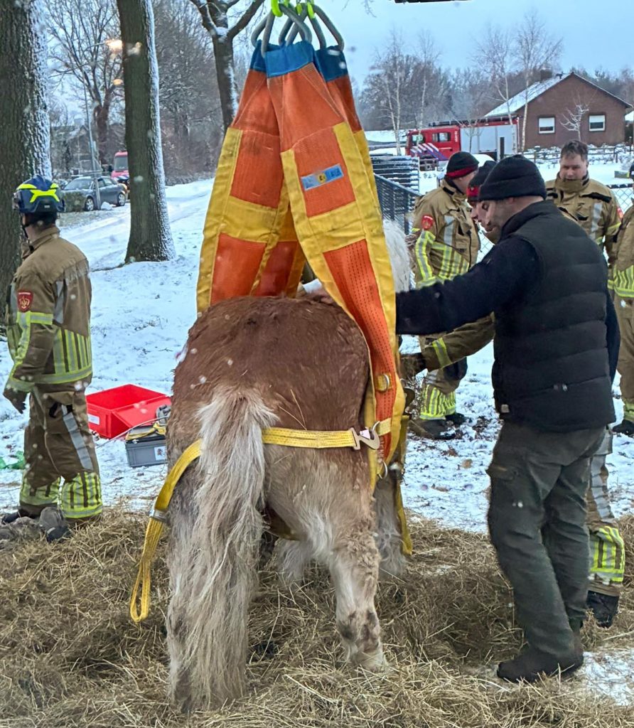 Door glad asfalt kwam een paard ten val en kon niet meer zelfstandig overeind komen. Met hulp van de paardenbroek van de SHE (specialistisch hulpverleningseenheid) van Brandweer Panningen en de verreiker van Giel Hermans hebben we het dier veilig weer rechtop gekregen.