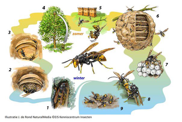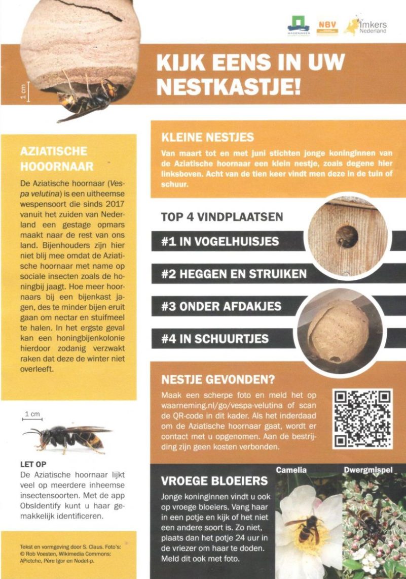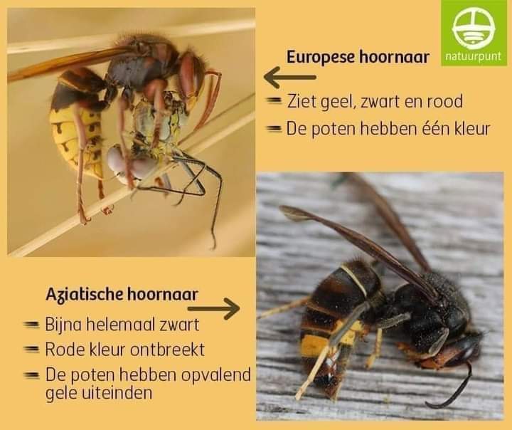 Nu het weer zonnig en warmer wordt ontwaken de Aziatische Hoornaar koninginnen uit haar winter schuilplek. Zij zijn in het najaar bevrucht en beginnen aan een zg. embryonest. Vanaf maart houdt zij zich hiermee bezig, in houtopslag, heggen, nestkastjes, onder afdakjes en in schuurtjes. Daar is zij de komende 6 weken mee zoet, oefen in het herkennen van de AZIATISCHE ( Geelpoot-) HOORNAAR –>Ā overwegend zwart met gele poten.…….scroll naar beneden voor een afbeelding en vergelijk.