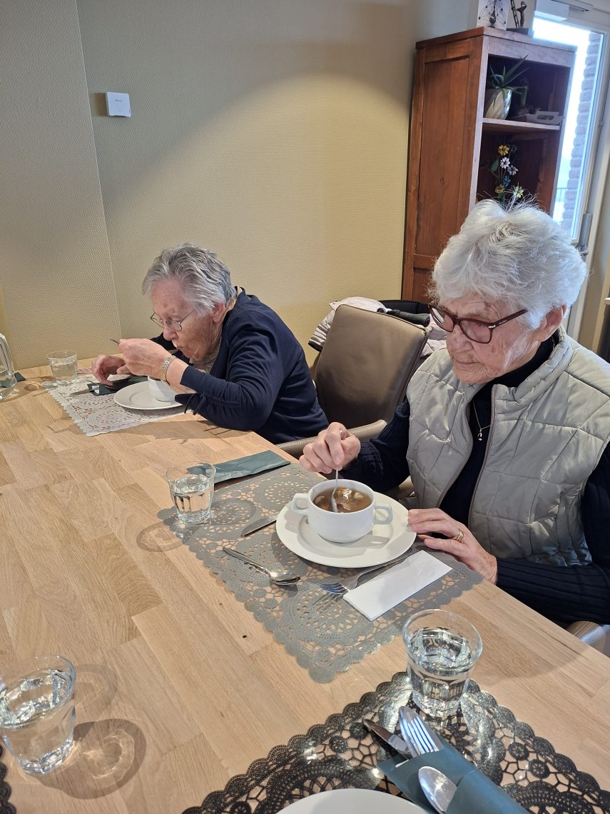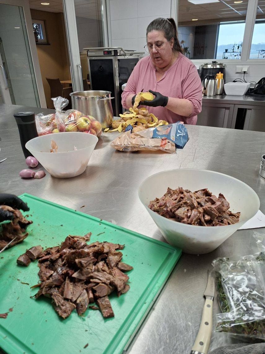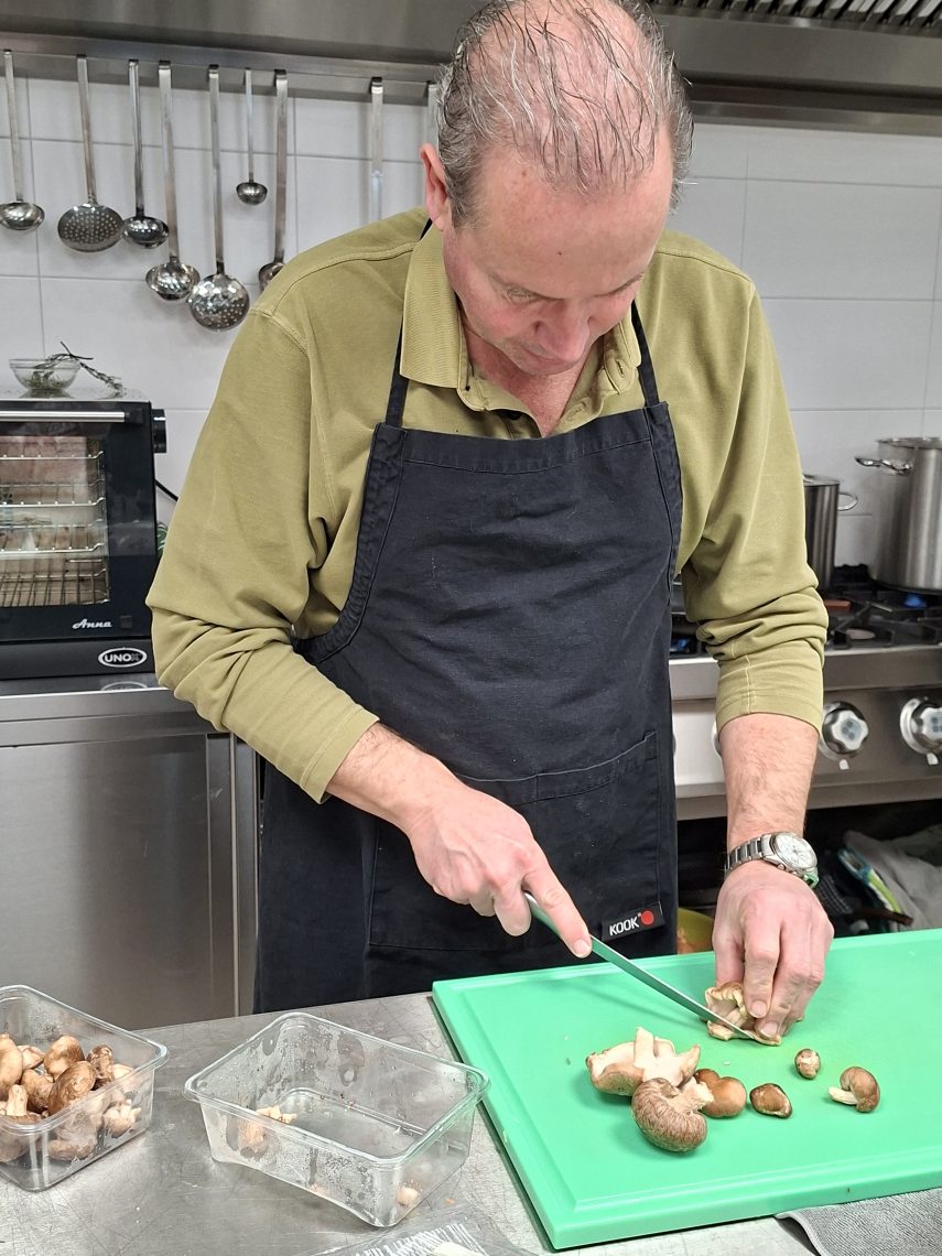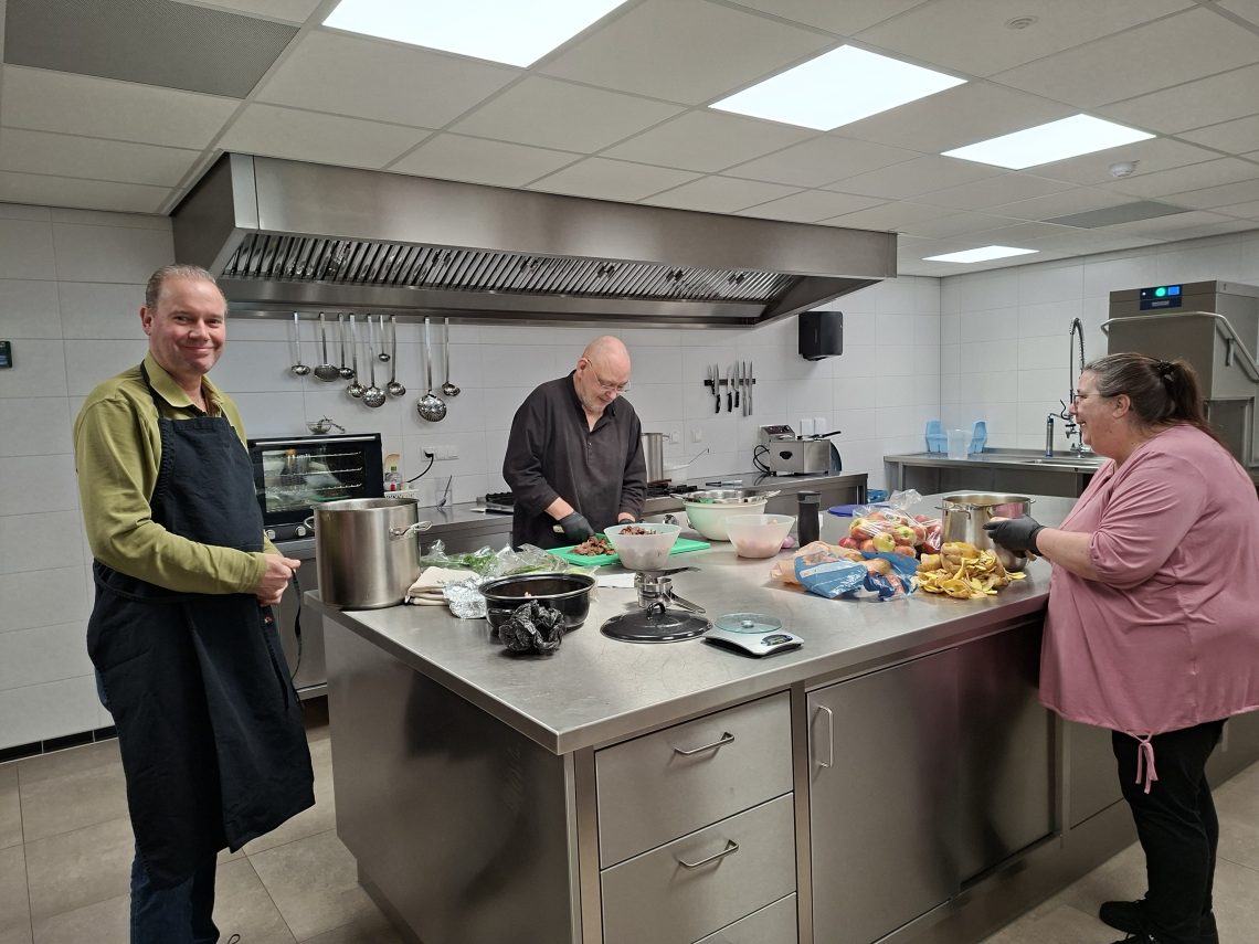 Afgelopen vrijdag 6 februari stond er iets bijzonders op het menu bij de Dorpsontmoeting Kessel. Giel Hermans van de Hereford slagerij in de Donk sponsorde wild zodat de gasten konden smullen van haas en fazant. De fazant werd gebruikt in een lekkere soep van Harald Giesbertz waarin ook groentes en shiitake paddenstoelen zaten. De haas werd opgediend in een heerlijk saus, gemaakt door Jochen Schlaghecke die ook de aardappelpuree, de spruitjes met spekjes en de zelfgemaakte appelcompote voor zijn rekening nam. Vaste vrijdag kok Mia maakt als toetje tiramisu. Mariet van Knippenberg fungeerde als keukenhulpje en zo kun je wel een beetje spreken van kookteam Kessel24 met gasten.
