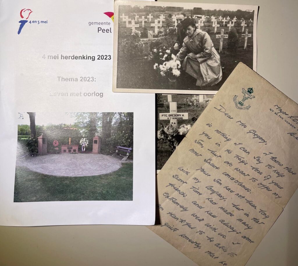 Mijn vader maakt geregeld per fiets de trip naar Venray om bloemen te brengen, hij vindt het zelfs zo belangrijk dat hij en mijn moeder op hun trouwdag in 1949 foto’s laten maken bij het graf. Op uitnodiging van de Gordon Highlanders reizen ze samen naar Schotland waar hij geeerd wordt en mooie cadeaus ontvangt.